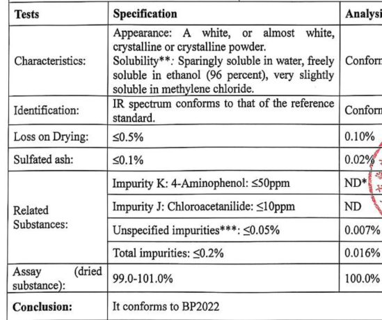 Acetaminophen, with the molecular formula C8H9NO2, is usually a white crystalline powder. It has antipyretic and analgesic effects and is used for treating colds and fevers, joint pain, neuralgia, migraines, cancer pain, and postoperative pain relief, etc. It is prepared by reducing sodium p-nitrophenol to para-aminophen and then acylating it.